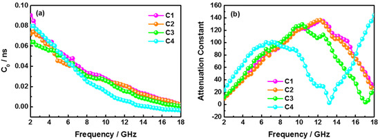 The unchanged C0 forebodes the powerful eddy-current loss in the microwave absorption process. In Figure 8a, here the continuous declining of C0 in all samples indicates insignificant eddy current dissipation in these composites. The dominating absorption in C4 samples is attributed to dipole polarization produced by abundant defects as displayed in Figure 2b and Figure 4e. Besides, the comprehensive judgment of microwave transmission capacity in absorbers could be characterized by attenuation constant (α), which is represented as following [47,48,49]: