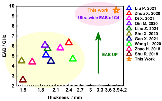 Most importantly, impedance matching is a principal element in determining whether the incident microwave could enter into the MAMs to be further consumed [50]. Figure 9 gives the impedance distribution of C1-C4 composites under different thicknesses. The areas between two red lines of 0.8 and 1.2 are adaptive regions for acceptable matching condition. Hence, it is obvious that the multiband matching of impedance in samples promote their microwave absorption in these bands. Moreover, the reducing thickness of matched impedance from C1 to C4 suggests the realizable EAB in thinner thickness, especially the wider matching region of impedance in C4 composite provides its broad EAB compared with other samples. Figure 10 displays the comparison of electromagnetic wave absorption properties in these samples. Apparently the C4 possesses relatively large RL with super-wide EAB at thinnest thickness. Moreover, the detailed microwave absorbing performance of as-prepared C4 and other related EMW absorbers are shown in Figure 11 [5,6,9,10,11,12,13,51,52]. It can be seen that the EAB of C4 is much wider than that of other composites, though the thickness is 3.9 mm; indicating its wide prospect of application for practical usage.