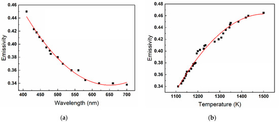 Above all, the emissivity calculation model (ECM) was built to reduce the temperature detection error. The relationship and equation between the wavelength and emissivity of lower alloy steel under 1147 K are shown in Figure 1a and Equation (1), respectively, whereas the temperature and emissivity of lower alloy steel under a 665 nm wavelength are shown in Figure 1b, and the equation is derived as Equation (2). The two equations about emissivity with the wavelength and temperature are only in the separate condition, which is not suitable for high rail steel plates, where it is essential to built and fusion model including wavelength and temperature. The ε_λ (655 nm) is 0.3408 and ε_T (1147 K) is 0.3568 under the respective conditions, so the relative error δ (λ ~ T) is 4.48%. To verify the general formula of Equation (1) to other wavelengths, it seems that those two parameters have a strong correlation, indicating that Equation (1) could be applied in other ranges of the wavelength.