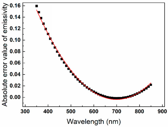 According to the above analysis, the errors in the emissivity model of rail steel plates have come from two main aspects. On the one hand, regarding the error caused by the emissivity fitting process, the R-Square (COD) of the wavelength and temperature is 0.9887 and 0.9853 in Equation (1). Secondly, those two-emissivity models are just under a specific single wavelength and a certain temperature due to the high cost of the full-wavelength and temperature experiment. Thus, the emissivity model can be modified from the following two aspects in this paper. On the one hand, the errors produced by Equations (1) and (2) will be minimized by . On the other hand, the absolute error of emissivity with wavelengths shown in Figure 2 and Equation (3) will also be considered. Accordingly, Equation (2) can be modified by Equation (5) to represent the emissivity variation with temperature and wavelength. The error analysis results of the emissivity model are shown in Table 1 and the largest relative error for emissivity variation with temperature and wavelength is approximately 1.21%, which indicates that the relative error of the revised model can satisfy the temperature calculation requirement.