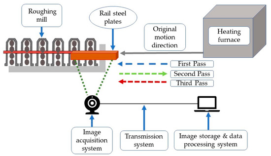 The diagram of the digital imaging system in the rail steel plates rolling process (online version in color).