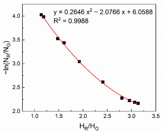 The method of measuring the temperature of a thermally radiating object as a function of the ratio of its spectral radiance at two wavelengths under the center temperature conditions is called colorimetric thermometry, and is also named the two-color method. If the greyscale values emitted from the same point are measured simultaneously at wavelengths and , respectively, temperature T is shown as Equation (6). The detailed calculation steps of colorimetric thermometry can be seen in references [29,30].