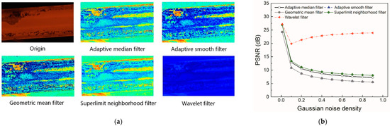 The five denoising methods were applied to denoise the images of rail steel plates; the denoising results are shown in Figure 5a, indicating that the denoised images obtained by those methods have retained the edge details as well as high-temperature parts in the images. The peak signal-to-noise ratio (PSNR) criterion is applied to evaluate the effectiveness of those five denoising methods, which is calculated by the error between the resultant image after the filtering and denoising of the original noise-free image. A larger PSNR value means a better denoising result for the original image. The detailed calculation steps of denoising methods and PSNR can be seen in references [34]. The PSNR of noise density for different denoising methods of image-joining Gaussian noise is shown in Figure 5b; the PSNR value is the largest for the wavelet filter denoising method when the noise density is 0.01. With the increase in noise density, the PSNR value of the wavelet filter denoising method is nearly maintained, whereas the others show a significantly tendency to decrease. Consequently, the wavelet filter denoising method is suitable for denoising the high-temperature rail steel plate.