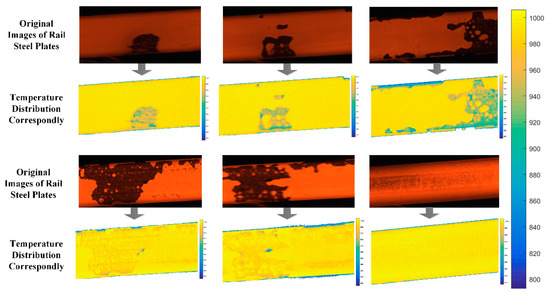 To calculate the temperature distribution of rail steel plates radiation images, the acquired images were first denoised by using a wavelet filtering algorithm, and then the temperature distribution was calculated by using a colorimetric thermometry model based on the emissivity model and blackbody furnace calibration results. Then, the temperature distribution matrix of the plate after the heating zone of two images for red and green wavelengths was substituted and finally calculated; part of those are shown in Figure 6. The temperature of each pixel in the original photos of rail steel plates was computed and presented in the corresponding temperature distribution images, while the background of the original photographs was also erased using the edge-processing approach. The initial rolling pass collects pictures containing iron oxide on the surface of the rail steel plate. As a result, the average temperature of each pixel in the temperature distribution image is identical to the temperature of each original image. Moreover, the temperature in the iron oxide area is 100 °C to 150 °C lower than that of the normal ‘smooth’ surface, although the temperature in the brighter color parts is significantly greater than in the lower ones, indicating that the temperature is not uniformly spread throughout the surface of the rial steel plate during the rolling operation.