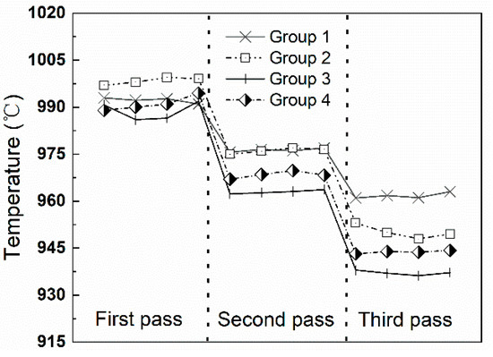 Rolling the prescriptive size and performance of rail steel plate products usually requires several high-temperature rolling passes. Temperature variation in the different passes is a key parameter in determining the cooling rate, which could also determine the control parameters of the rolling process and the performance of final rail steel products. In this paper, four typical images from one certain pass of rail steel plate were selected in each rolling pass, and the temperature distribution was calculated and summarized, as shown in Figure 7. Therefore, Group 1 to Group 4 represent the different rail steel plates that have entered through the areas of the field of view of the digital imaging system in Figure 3. According to practical experience, the temperature of these plates drops to around 1000 °C when it enters the rolling stage after water jet cooling. The calculated results show that the four temperatures in the first pass are in the range of 980 °C to 1000 °C, and the difference in each point at the same pass is nearly approximately 10 °C, indicating that the temperature calculation results for a single pass are reasonable and comply with experience. In the first rolling pass, the average temperatures of each group are not the same due to the inhomogeneity of the furnace temperature control per different batch of rail steel plates. It could also be observed that the temperature of the later pass is lower than that of the front one, showing that the temperature of the plate gradually decreases during the rolling process. This could be explained by the fact that the rail steel plates will go through a series of processes, such as rolling, water spraying, turning, rolling, and water spraying, during the rolling process, causing the surface temperature to show a tendency to decrease, whereas the temperature fluctuates in the range of 920 °C to 960 °C in the final pass. These results could benefit the control of the cooling rate and optimize the rolling model during rolling passes.