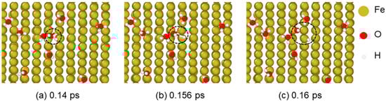 In order to study the corrosion process of a perfect crystal, we simulate the pure Fe-H2O interfacial corrosion of Fe (110) single crystal for that the (110) surface is the most stable close-packed one. The corrosion processes of the single crystal are shown in Figure 2. It can be found that water molecules are adsorbed on the surface of the Fe substrate at 0.14 ps (Figure 2a); then the hydrogen-oxygen bond of the water molecule begins to stretch (Figure 2b); and finally, the water molecules decomposed completely into OH− and free H+ ions (Figure 2c). The chemical reaction during the corrosion process is shown below: