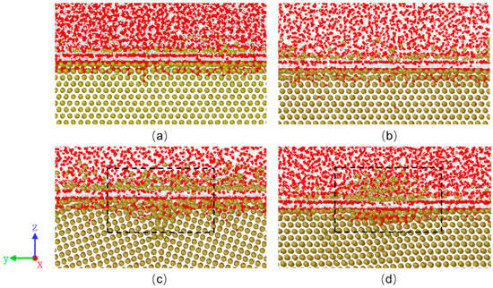 In Fe single crystal, O ions penetration uniformly into the Fe substrate to form oxides (Figure 3a). The Fe (110) surface with a sigma3 twins is also studied, as shown in Figure 3b. It can be found that the corrosion process of the sample with sigma3 twins is similar to that of single crystals. After water molecules decompose on the Fe surface, Fe atoms will dissolve into the water solution, O ions will penetrate into the Fe substrate to form oxides, and H ions will diffuse into the Fe substrate. The existence of the twin grain boundary does not affect the corrosion rate of the Fe substrate. This situation is because the sigma3 grain boundaries are relatively stable and not easy to corrode.