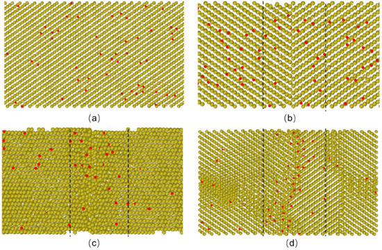 To verify the above speculation, we simulate the corrosion of the polycrystalline grain boundary. According to Figure 3d, polycrystalline consists of three grains, and irregular grain boundaries are obtained by rotating the grain in the middle. The corrosion phenomenon of polycrystal is similar to sigma5 twins, but the phenomenon of grain boundary corrosion is more prominent. Many Fe atoms on the grain boundary are dissolved and O ions penetrate rapidly into the grain boundaries to form oxides. The number of dissolved Fe atoms in polycrystals is far greater than that of sigma5 twins, and the corrosion rate of grain boundaries is speedy. This may be related to the reduction of Fe work function (ionization energy) during H2O adsorption obtained by the multielectron intercalation theory [17] and may also be related to stress.