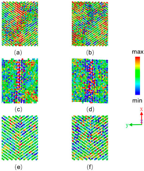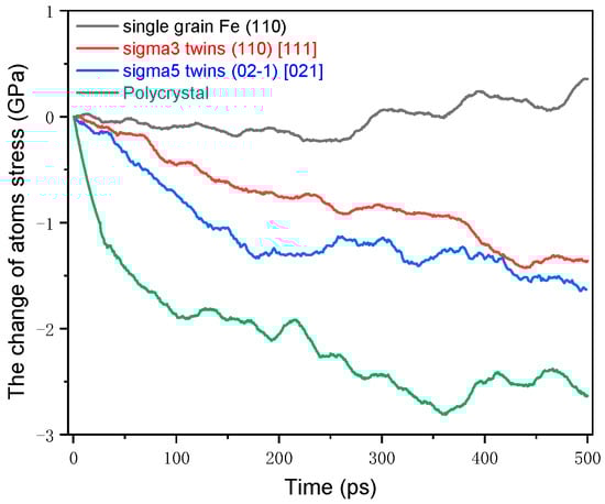 It is found that O ions penetrate faster at the polycrystalline and sigma5 twin grain boundaries, and local corrosion occurs at the grain boundaries, as shown in Figure 4. In the polycrystalline model, O ions first penetrate into the grain boundaries and then along the grain boundaries to the surroundings to form oxides. In the twinned system, a small number of O ions are distributed on the sigma5 twin grain boundary. However, it is impossible to judge whether it penetrates along the grain boundaries, and the O ions in the sigma3 twins exhibit uniform penetration. During the corrosion process, the stress changes at the grain boundaries, as shown in Figure 5. The stress at the polycrystalline grain boundary decreases in a wide range during the corrosion process, and the stress at the sigma5 twin is only reduced at the grain boundary, but the stress at the sigma3 twin remains unchanged. The variation range of stress is consistent with the penetration range of O ions.