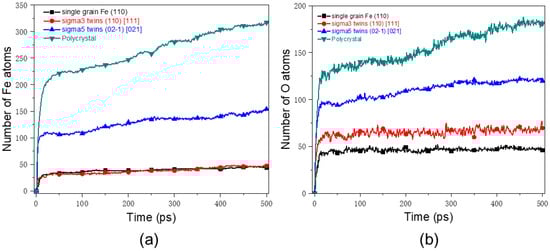 The effects of different grain boundaries on the corrosion process were compared by counting the number of dissolved Fe atoms near the grain boundaries and the number of O ions diffused into the Fe substrate. According to Figure 7a, the number of dissolved Fe atoms in polycrystalline and sigma5 twins is the largest due to the early stress release. Within 50 ps, about 250 Fe atoms are dissolved from polycrystalline, and about 100 Fe atoms are dissolved from sigma5 twins. The number of dissolved iron atoms in sigma3 twins and single crystals is roughly the same. Figure 7b shows the number of O ions penetrating into the vicinity of the grain boundaries of the iron substrate. It can be seen that a large number of iron atoms at the grain boundaries of the polycrystalline model are dissolved, and most vacancies are formed on the surface, which causes O ions to penetrate into the substrate quickly. Therefore, the polycrystalline model has the most oxygen atoms penetrating into the substrate. Approximately 100 O ions in sigma5 twins penetrate into the substrate. The number of oxygen atoms in sigma3 twins is 20 more than that in single crystals, but the number of dissolved Fe atoms is the same.