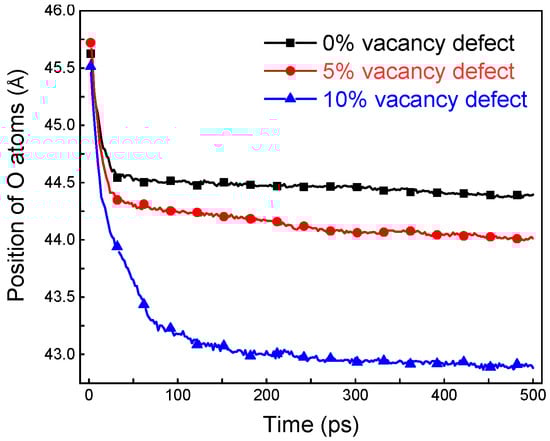 Corrosion at grain boundaries is always accompanied by the massive dissolution of Fe atoms at grain boundaries. Therefore, we simulated the effect of the concentration of vacancies in the Fe substrate on the penetration of O ions in corrosion. Randomly add vacancies in the Fe substrate, and the vacancy concentration is 0%, 5%, and 10%. The result is shown in Figure 8. The concentration of vacancies affects the penetration and depth of O ions penetrate. When the vacancy concentration is 5%, the penetration depth of O ions only increases by 0.25 Å, but when the vacancy concentration rises to 10%, the penetration depth of O ions increases by 1.5 Å. We can conclude that the concentration of vacancies in the Fe substrate reaches a certain level, and O ions can quickly penetrate into the bulk. In intergranular corrosion, the excessive initial stress of the grain boundary causes a large number of Fe atoms at the grain boundary to dissolve to form vacancies, which makes it easier for O ions to penetrate into the substrate to form oxides in accelerated local corrosion.