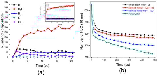 The dynamic evolution of the chemical composition of the Fe/water interface system is shown in Figure 9a. In the early 5 ps of corrosion, due to the adsorption and dissociation of many water molecules, a large number of byproducts such as H3O+, H2, OH−, and H atoms are generated, which means that the early corrosion rate is high. After 10ps, the system enters the slow-corrosion state. After the dissociation of water molecules, O ions diffuse into the Fe substrate, and H ions enter the solution to form H3O+. Therefore, as the corrosion progresses, the amount of H3O+ gradually increases. Figure 9b shows the changes in the number of water molecules over the simulation time. To avoid interference, we only count the changes of water molecules above the grain boundaries. The changing trend of water molecules in all models is the same. The significant reduction of water molecules in the first 50 ps means a faster corrosion rate. After the initial passivation, the number of water molecules slowly decreases. As the angle of the grain boundary increases, the number of water molecules decreases. It also shows that the existence of grain boundaries will affect the adsorption and dissociation of water molecules and the subsequent penetration of oxygen atoms.