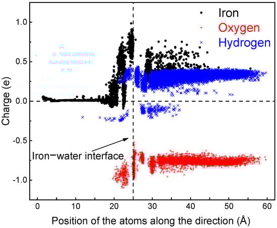 The atomic charge distribution at the end of the pure Fe-H2O system simulation is depicted in Figure 10. The charge of the Fe atoms at the bottom of the metal substrate has fluctuated around 0 e. The charges of O and H atoms in the solution fluctuate slightly around −0.775 e and 0.320 e, respectively. These atomic charges are consistent with the previous simulation articles [19]. Charge exchange mainly occurs in the electric double layer, where the Fe atom loses electrons, and the charge of the surface Fe atoms rises to nearly 0.7 e. In addition, the charge of oxygen atoms diffused into the Fe substrate decreases to 0.3 e. When hydrogen atoms enter the Fe substrate as interstitial atoms or combine with Fe atoms in the solution, the hydrogen atoms possess a specific negative charge of about 0.2 e. In contrast, the hydrogen atoms in the OH− ions still carry a positive charge. The related research reveals that the H atoms spread into the Fe substrate possess a negative charge [32,33]. Therefore, during the corrosion process, there is a process of redistribution of electric charge on the pure Fe-H2O system.