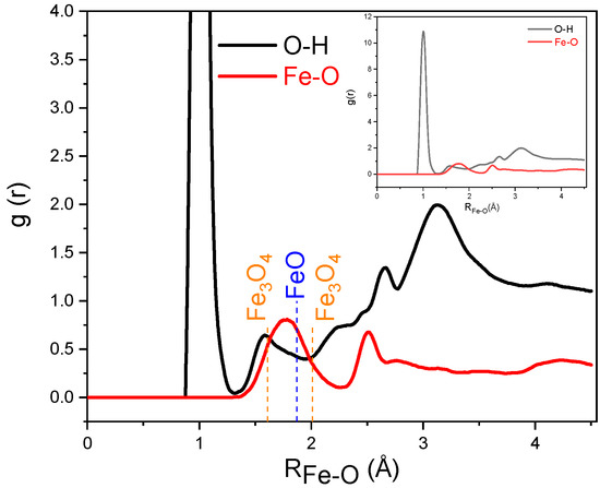 The radial distribution functions (RDFs) can study the different Fe oxide phases in simulation can be studied by the radial distribution functions (RDFs). Generally, the partial radial distribution function (RDF), g (r), defined as the probability of an atom at a distance from the origin, which is used to characterize the bonding and the structure of the formed oxide film [34,35]. Figure 11 shows the RDFs for the O-H bond and the Fe-O bond at the end of the simulation. The RDFs were calculated every 0.4 ps and took an average of 450 to 500 ps. It has two prominent peaks for the Fe-O bond length. The first peaks at 1.78 Å correspond to the interaction of Fe ions and OH- ions, but this peak spans from 1.5 Å to 2.5 Å covering the peaks of FeO, Fe2O3, and Fe3O4. These results show that the oxide film formed on the Fe surface mainly consists of Fe hydroxides and oxides in the corrosion process. The transformation trend is the transformation of Fe hydroxide to Fe oxide.