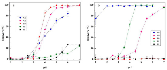 The effect of pH of leach liquor on metal extraction was firstly carried out to determine the possible separation scheme for each transition metal, which was investigated within range 1–7. The constant variables in the study included organic/aqueous (O/A) volume ratio 1, extractant concentration 20% v/v, and equilibrium time 15 min at room temperature. The results of the studies are depicted in Figure 1. Cyanex® 272 effectively transferred Cu, Co and Mn (Figure 1a) while rejecting Ni (pH 1–4) and Li (pH 1–5). The maximum extraction rate for Ni and Li were 24% and 27% at pH 7, respectively. Equilibrium pH50 for the three metals (Mn, Co and Cu) were estimated to be 2.2, 2.3 and 2.5 (Figure S1), respectively. These results were lower compared to pH50 values obtained from sulfate media (pH50 Cu 3, pH50 Co 3.75 and pH50 Mn 3.5) reported by Solvay [29]. Previous reports on solvent extraction of transition metals from sulfate media revealed that the presence of acetate ions would decrease the pH50, making the metal extraction possible in more acidic conditions [30]. Increasing metal transfer at lower pH was hypothetically caused by the ability of acetate to buffer the pH during the extraction, and not by the role of acetate in complex (metal-ligand) formation during the extraction. However, based on modelling using Hydra and Medusa, Cu, Co, Mn and Ni form acetate complex in a weak acidic to neutral pH range (Figure S2). In the case of Co and Mn, both metals produce cationic species Co(CH3COO)+ and Mn(CH3COO)+, respectively, while Ni and Cu form neutral species Ni(CH3COO)2, and anionic species Cu(CH3COO)3−, respectively. This explains why Cyanex® 272 (acidic extractant) had stronger affinity to Co and Mn, due to the positive charge of both metal species, compared to Cu and Ni, which as complexes are less charged.