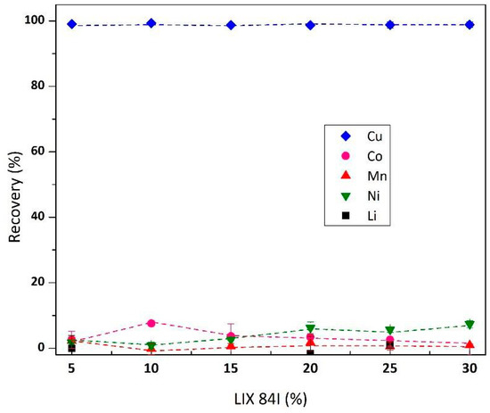 Effect of LIX® 84-I concentration (v/v) on Cu isolation from leachate (pH 3, metal concentration in feed Cu 0.23 g/L, Co 3.54 g/L, Mn 0.16 g/L, Ni 0.14 g/L and Li 0.62 g/L).