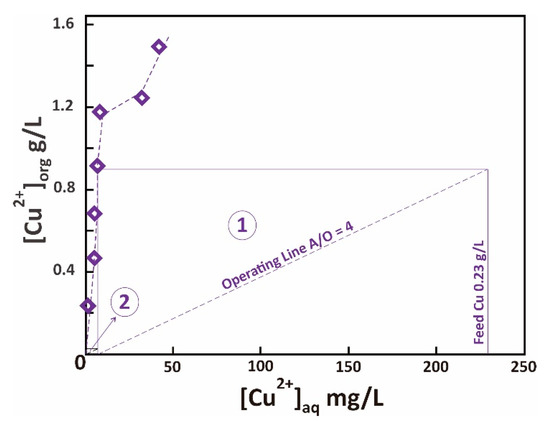 Extraction isotherm of Cu using LIX® 84-I 10% v/v, pH 3, McCabe-Thiele plot is shown for A/O ratio 4.