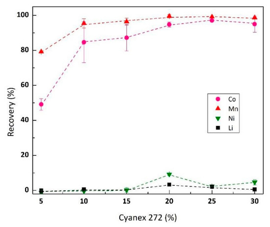 Effect of Cyanex® 272 concentration (v/v) on Co-Mn co-extraction from raffinate (pH 5, metal concentration in feed Co 3.3 g/L, Mn 0.16 g/L, Ni 0.14 g/L and Li 0.62 g/L).