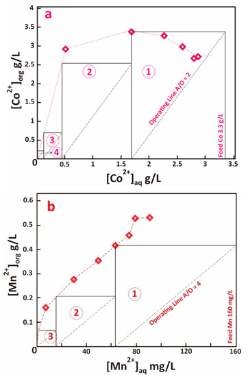 Co and Mn were co-extracted from raffinate using Cyanex® 272 after the pH of raffinate was adjusted to 5 using sodium hydroxide. Figure 4 demonstrates the effect of Cyanex® 272 concentration (5–30%) on the Co and Mn extraction rate (constant variable feed solution Co 3.3 g/L, Mn 0.16 g/L, Ni 0.13 g/L, Li 0.62 g/L, A/O ratio 1, 15 min equilibrium at room temperature). The figure shows that the minimum Cyanex® 272 concentration for Co-Mn co-extraction is 20%. No significant Ni and Li recovery were observed as Cyanex® 272 concentration increased. Extraction isotherm study discerned the effect of A/O ratio (1–7.5) to the Co-Mn co-extraction (Figure 5), resulting in maximum Co and Mn loading capacity of Cyanex® 272 to be 3.5 g/L Co and 0.53 g/L Mn. Lower loading capacity of Cyanex® 272 by Mn was due to stronger affinity and far higher concentration of Co in the feed solution. The McCabe-Thiele plot in Figure 5 gives the number of theoretical stages required for complete Co-Mn co-extraction using Cyanex® 272 10% v/v, which is resumed in Table 5.