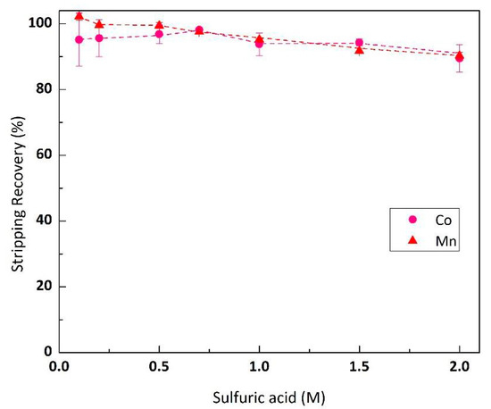 Stripping the loaded organic (Cyanex® 272 10% v/v, Co 3.3 g/L and Mn 0.17 g/L) was performed by 10 mL loaded organic with 10 mL sulfuric acid (0.1–2 M). The results in Figure 6 demonstrate that a low concentration of sulfuric acid 0.1 M is sufficient for quantitative Co and Mn stripping (Co 95.1%, Mn 102.2%). The trend of stripping rate in Figure 6 tends to decrease slightly as the sulfuric acid concentration rises. This was probably due to increasing sulfate in the stripping solution, which depressed the solubility of CoSO4 and MnSO4 (effect of similar ion).