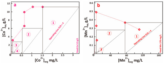 Stripping isotherm of (a). Co and (b). Mn from loaded organic (feed Co 3.3 g/L, Mn 0.17 g/L) using sulfuric acid 0.2 M, McCabe-Thiele plot is shown for O/A ratio 5 (Co) and 4 (Mn).