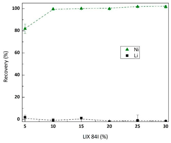 Effect of LIX® 84-I concentration (v/v) on Ni and Li extraction from raffinate (pH 5, metal concentration in feed Ni 0.13 g/L and Li 0.55 g/L).