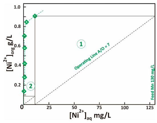 Extraction isotherm of Ni using LIX® 84-I 10% v/v, pH 5, McCabe-Thiele plot is shown for A/O ratio 7.