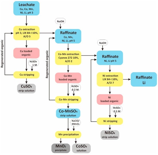 The target metals are dissolved in the leach liquor (leachate) during leaching, and separation and purification steps are required to recover these metals. These steps include solid-phase extraction (adsorption), precipitation, crystallization, solvent extraction (SX), or a combination of these. Adsorption is generally effective to recover target metal ions of which concentrations are within mg/L order [17]. In the case of precipitation and crystallization, the typical concentration is at the other end of the spectrum (tens of g/L) to reach saturated concentration in order to initiate the process. Precipitation and crystallization are considered less selective methods; hence the product is prone to impurities. Solvent extraction is regarded as the best separation and purification method, considering the typical metal concentration in leachate (g/L). A literature review on the treatment of leachate using solvent extraction reveals that most of the leachates were produced by black mass leaching using strong mineral acids, especially sulfuric acid (Table 1). This correlates with the extensive application of sulfuric acid as lixiviants in various battery recycling schemes, either in processes which are still in the development stage, such as the Aalto process [18], or in already commercialized processes, such as the Umicore and Batrec processes [2].