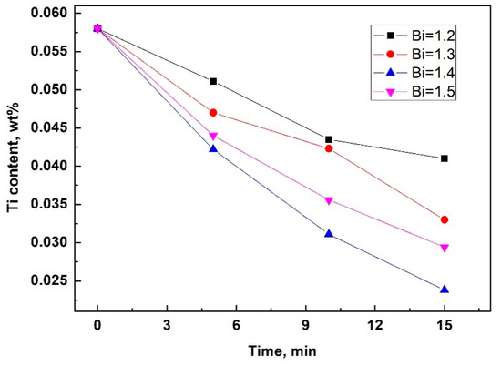The measured Ti content of the silicon samples that were obtained at different refining times is illustrated in Figure 1. The results indicate that after 15 min of refining, the highest Ti-removal rate was 59% when using slag with a BI of 1.4, and the Ti content decreased from 0.0580 wt% to 0.0238 wt%.