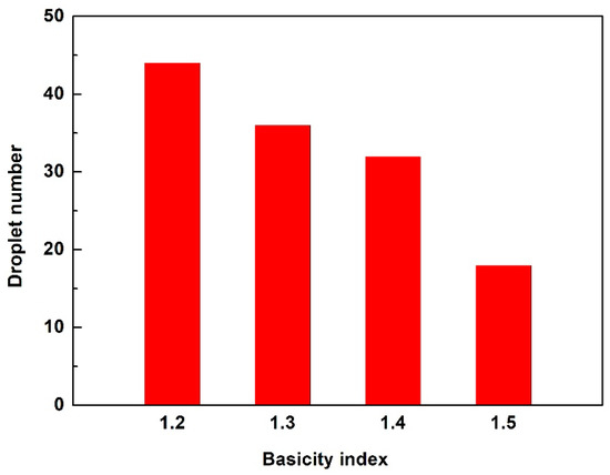 Effect of slag basicity index on the overall number of silicon droplets at the silicon–slag interface (inspection area: 1 mm × 1 mm).