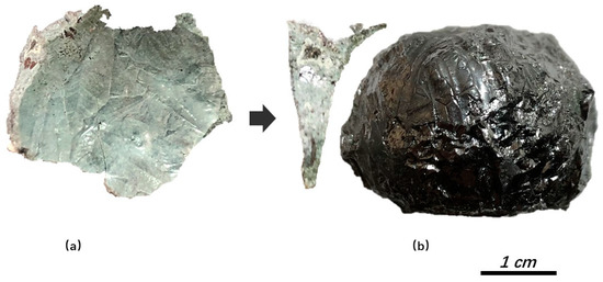 Solidified surface of slag that contacted with silicon (a) and cross-section of solidified slag and the contacted silicon lump (b).