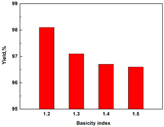 Effect of basicity index of slags on the yield of silicon after 15 min of refining.