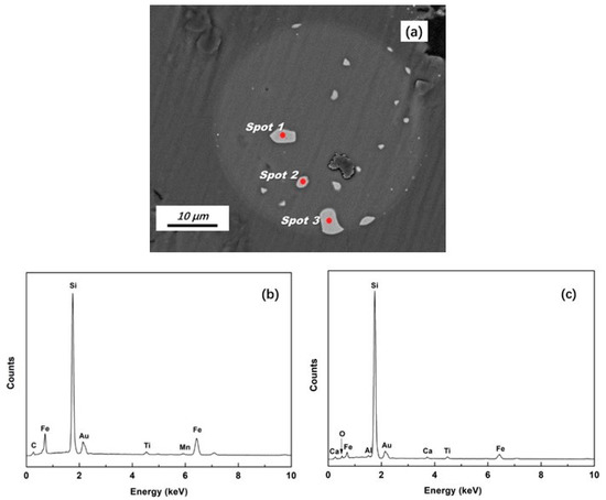 Under the current conditions, samples from the slag–silicon interface were obtained and rapidly quenched after 5 min of refining. A typical SEM image of the quenched sample is shown in Figure 6, where a silicon droplet exists in the refining slag (approximately 40 µm in diameter). The features of impurities were preserved and no crystals were detected in the slag because of rapid cooling. The composition of the typical impurities in this droplet was measured using EDS (electron energy of 10 keV to avoid interference from the matrix or surrounding areas). Corresponding results are shown in Table 5. The Ti content at spot 1 is 2.48 wt%, 1.75 wt% at spot 2, and 0.49 wt% at spot 3. It should be noted that a certain amount of oxygen was detected at spot 3. In fact, further EDS analyses indicated that all impurities at the slag–silicon interfaces contained different contents of oxygen. In addition, wetting of the impurity phases with slag at the slag–silicon interface was observed (especially at spot 3). These results indicate that before solidification the impurities in the silicon melts were already concentrated, wetted by slag, and oxidized at the slag–silicon interfaces.