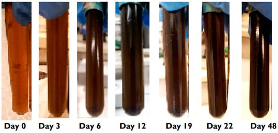 The B7 medium was used as the enrichment medium for maintaining the IRB culture. This medium is designed especially for the IRB [], and therefore, contains high contents of ferric ammonium citrate (10 g/L) and yeast extract (5.0 g/L). Figure 1 follows the growth of the IRB in the B7 medium over a 48-day period. Initial colour, at the time of IRB inoculation (at day 0) is brown. This colour gradually changes to dark green, which indicates the ability of IRB to reduce Fe3+ ions from ferric ammonium citrate to the ferrous ions (Fe2+) []. From day 3 onwards, a gelatinous substance was observed to have deposited at the bottom of the test tube (though not clearly visible in Figure 1). This precipitate was sticky and difficult to remove from the test tubes, at the end of experiments.
