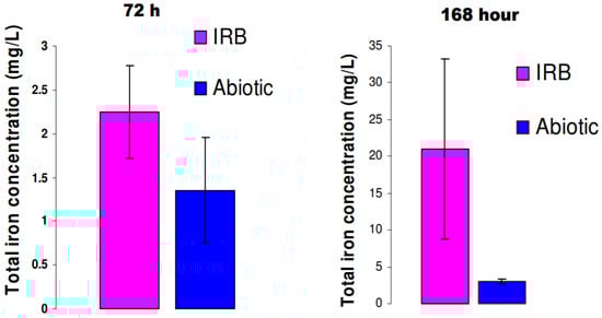 Figure 2 shows quantification of total iron (Fe2+ and Fe3+) in the modified Postgate C medium in the presence of the IRB and carbon steel specimen. As suggested, the concentration of iron increased over time in the presence of the IRB, form 2.2 mg/L after 72 h to 21 mg/L after 168 h. The IRB is known to reduce insoluble Fe(III) oxides such as goethite, hematite, ferrihydrite, akaganéite, and lepidocrocite into soluble ferrous complexes [,,] and this is the most likely reason for the much higher dissolved iron concentration in biotic solution containing IRB.