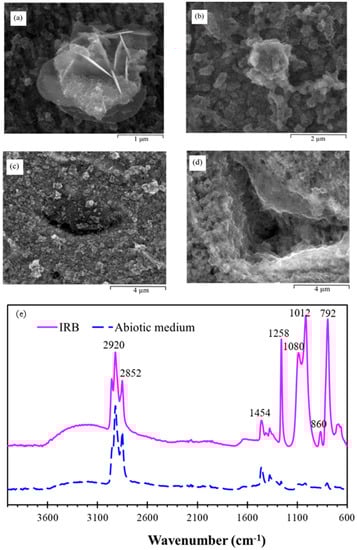 Figure 3e depicts IR spectrum of IRB biofilm developed on carbon steel exposed to pure culture of IRB in Postgate C medium for a period of 72 h, with the spectrum of abiotic Poctgate C for comparison. Hydrogen and fatty acids are primary products of IRB metabolism [] and the peaks corresponding to these fatty acids can be clearly identified for the IRB biofilm. Characteristic peaks corresponding to -CH3 asymmetric stretching (2956 cm−1), asymmetric -CH2 stretching (2920 cm−1) and symmetric -CH2 stretching (2852 cm−1) were observed confirming the presence of organic hydrocarbon chains in the IRB biofilm. Complementary bands for these hydrocarbons were found at 1454 cm−1 (asymmetric -CH3 bending/CH2 scissoring) as well as -CH3 symmetric bending at 1372 cm−1.