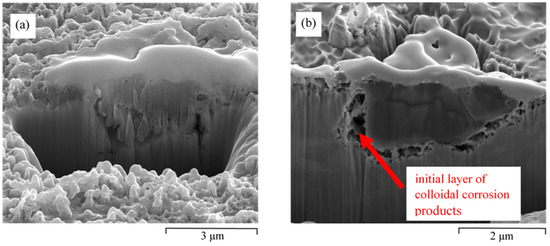 The FIB-SEM cross-sections (Figure 4a,b) show two separate pits covered by a loose corrosion product crust such as that shown in Figure 3c. The depth of these pits was approximately 1.5 µm. The biofilm covering the pit was loosely attached to the corroded carbon steel. The innermost layer was composed of initial layer of colloidal corrosion products. The loose attachment between the metal and biofilm material covering the pit allows chemical species from electrolyte to come in contact with the metal to facilitate pit propagation. High organic material in the IRB biofilm caused charging and sample movement when FIB milling was being carried out. This difficulty in obtaining clean cross-sections from FIB milling only occurred in the IRB pure culture biofilm, due to the higher organic EPS material in the biofilm which were not electron dense.