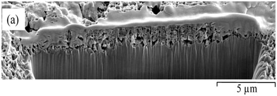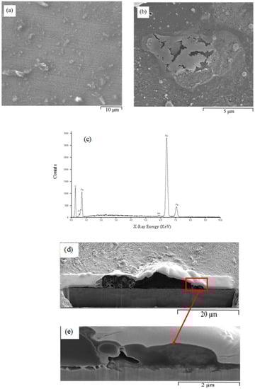 FIB-SEM cross-section characterization was carried out also for another location in the sample exposed for 168 h (Figure 15). In this case, the sample suffered some charging during SEM imaging, due probably to the high organic content in the IRB biofilm. Pit was covered under the corrosion product deposit (Figure 15b). The morphology showing an undercutting attack in Figure 15b is similar to pitting in acidic environments []. The cracking in the biofilm that was observed in the 72 h exposure to the inorganic medium occurred also in the 168 h exposure (Figure 15c). Biofilm extended into the cracks, as seen in the higher magnification images (Figure 15c). Similar to the 72 h exposure sample, EDS of the corrosion deposit covering the pit shown in Figure 15b detected a high intensity peak for carbon, indicating the presence of organic molecules. Other elements detected were sulphur, chloride and iron.