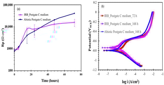 (a) Polarization resistance (a) of carbon steel exposed to a pure IRB culture and abiotic conditions in Postgate C medium, and (b) a potentiodynamic polarization and (b) scan of carbon steel after 72 h exposure with and without IRB.