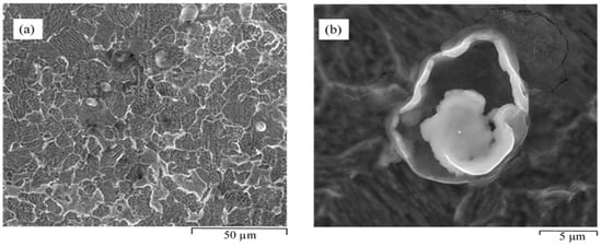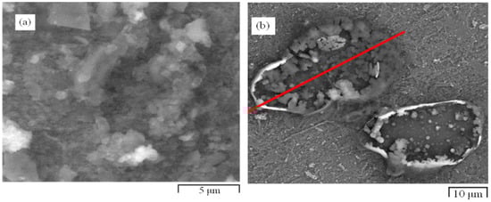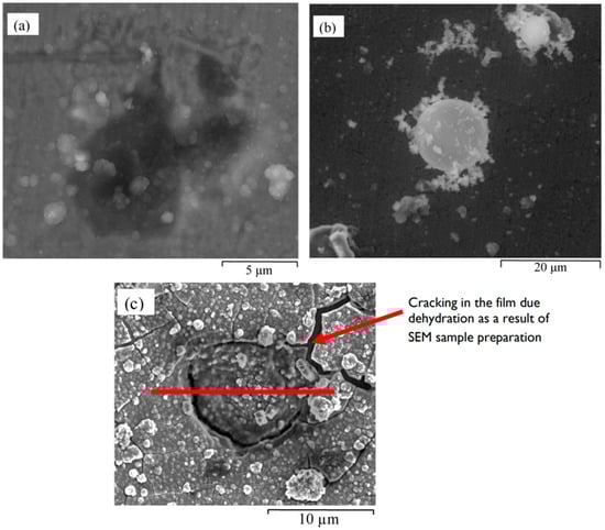 Following 72 h exposure of carbon steel to the IRB in the Postgate C medium, the specimen was covered by EPS-like material (Figure 3). Figure 3a shows a globular deposit of ~2 µm diameter. Much smaller globular precipitates can be observed in Figure 3b which are packed close together. Pits covered by loose corrosion product cap, as shown in Figure 3c,d, were also a common occurrence throughout the sample surface.