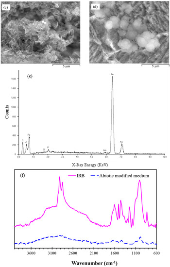 IR spectroscopy (Figure 3e and Figure 7f) as well as microscopic observations (Figure 4a) of the pure IRB biofilm showed that organic material in the form of EPS was more prevalent in the presence of S. putrefaciens. The adhesive nature of the EPS secreted by the IRB may have a role in facilitating attachment of other bacterial species and/or nutrients to the biofilm as well as in consolidating the biofilm structure. The binding of metal ions by negatively charged EPS carbohydrates and proteins has also been previously reported [].