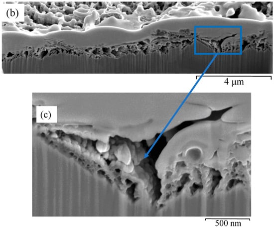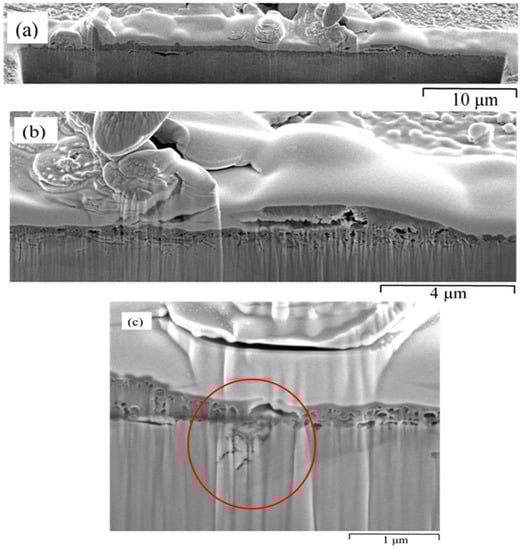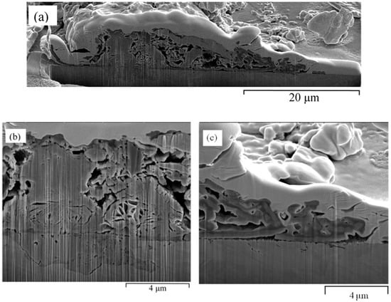 FIB-SEM cross-sectional analysis of biofilm formed on carbon steel by pure culture of IRB in inorganic medium following a 72 h exposure: (a) overview of the biofilm cross-section, and (b,c) the extent of cracking attack observed under the IRB biofilm at higher magnification.