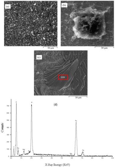 ESEM images of hydrated biofilm formed on carbon steel due to a pure IRB culture following 168 h exposure in the modified Postgate C medium: (a) overall covering (inorganic and organic components), (b) an iron oxyhydroxide shell covered in adhesive EPS material and (c) SEM image of precipitates of an iron phosphate species. (d) EDS analysis of the layered, plate-like deposit in Figure 9c.