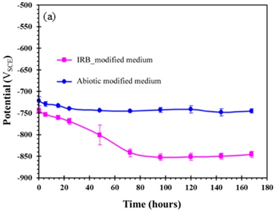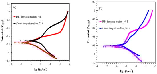 The build-up of biofilm was monitored using the OCP technique for a period of 168 h (Figure 10a). The negative shift in Ecorr that occurred in the presence of IRB biofilm due to either a decrease of cathodic reactant O2 caused by IRB aerobic respiration and/or an increase in the anodic dissolution of iron caused by a loss of protective nature of the passive iron oxyhydroxide film. During the OCP measurement, Ecorr stabilized quickly and did not oscillate a great deal, suggesting low oxygen conditions in solution. O2 consumption appeared to occur instantaneously as shown by a drop in Ecorr from initial reading of −744 mV at 0 h down to −842 mV at 72 h. The Ecorr then became stable during 72–168 h period where anaerobic or microaerobic conditions were set up by the bacteria. Consistent with this results, Sherar et al., reported an Ecorr < −800 mV with anaerobic corrosion of carbon steel []. Once anaerobic conditions ensued, the corrosion of carbon steel was controlled by a combination of H2O, HCO3− and Fe3+ reduction reactions.