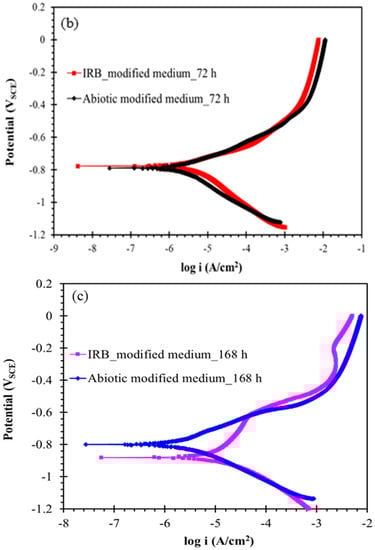 (a,b) Potentiodynamic polarization scans of carbon steel following 72 and 168 h exposure, with and without the IRB, to inorganic Postgate C solution.