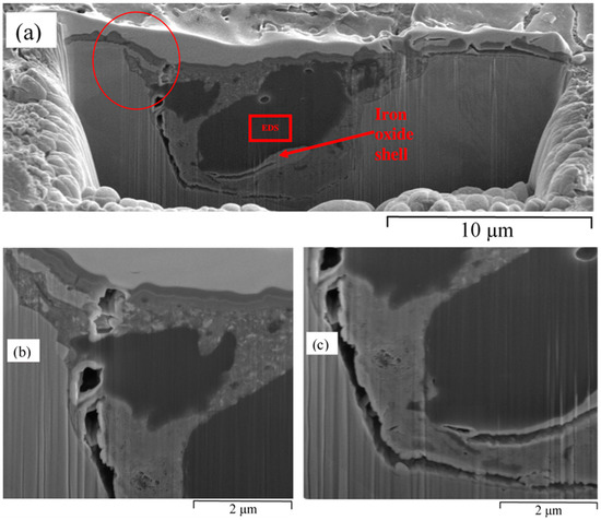 FIB-SEM in Figure 14a confirmed the existence of a deep pit under the area shown in Figure 13c. A pit (~10 µm deep) developed underneath the biofilm. In previous studies on stainless steels, growth of the pit may occur back towards the outer surface to where the pit originated [,]. The mechanism for such behaviour has been attributed to the passivation of the surface near the pit mouth due to concentration of metal ions being below the critical concentration for pit propagation (Ccrit). However, in the pit adjacent to the passivated area, Fe2+ ions are generated and the dissolution front progresses through the sidewall until the passive film is punctured []. EDS analysis from the area highlighted in Figure 14a showed a high intensity peak for carbon that can only be attributed to the high content of organic material in the biofilm, since the test medium of Postgate C only consists of inorganic constituents. Inorganic sulphate and chloride were also present. It is assumed that SO4− (as indicated by S and O in EDS) and Cl− ions moved to the corroding site to maintain electrical neutrality by balancing out the positive Fe2+ generated from the corroding carbon steel. They may also be incorporated into green rust minerals according to Equation (6). Another notable mineral present on the pit covering material was the hollow iron oxyhydroxides shells. These hollow shells were observed near the side walls (Figure 14b) as well as being incorporated between other corrosion product layers as outlined in Figure 14c.