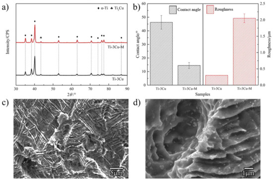 Physical properties of the Ti-3Cu sample and Ti-3Cu-M sample. (a) XRD pattern of Ti-3Cu and Ti-3Cu-M samples, (b) the water contact angle and the roughness, (c) low magnification and (d) high magnification surface morphology of the Ti-3Cu-M sample.