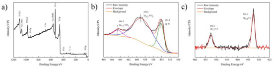 Figure 2a–c shows XPS spectra of the Ti-3Cu-M sample. The diffraction peaks of Ti, O and Cu were detected, indicating that the surface mainly composed of Ti, O and Cu elements. Figure 2b shows the high-resolution Ti 2p spectra of the Ti-3Cu-M sample. There were three peaks of Ti at the positions of 464.5 eV, 458.6 eV and 454.2 eV, respectively. After fitting, the first two peaks were the peaks of Ti4+, representing Ti 2p1/2 and Ti 2p3/2 respectively, and the third peak was the peak Ti0, indicating that part of Ti on the sample surface was oxidized to TiO2 after the surface modification. Figure 2c shows the high-resolution Cu 2p spectra on the Ti-3Cu-M sample surface. There were two peaks of Cu 2p1/2 and Cu 2p3/2 at 952.6eV and 932.6eV, respectively. After fitting, these two peaks were confirmed as the peak of Cu0. This indicates that no Cu oxide was formed on the surface after the surface modification.