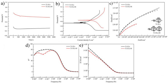 Electrochemical biocorrosion properties of the Ti-3Cu sample and Ti-3Cu-M samples. (a) Open-circuit potential curves, (b) Tafel curves, (c) Nyqiust diagrams, the insert shows the Equivalent circuit, (d,e) Bode phase plots.