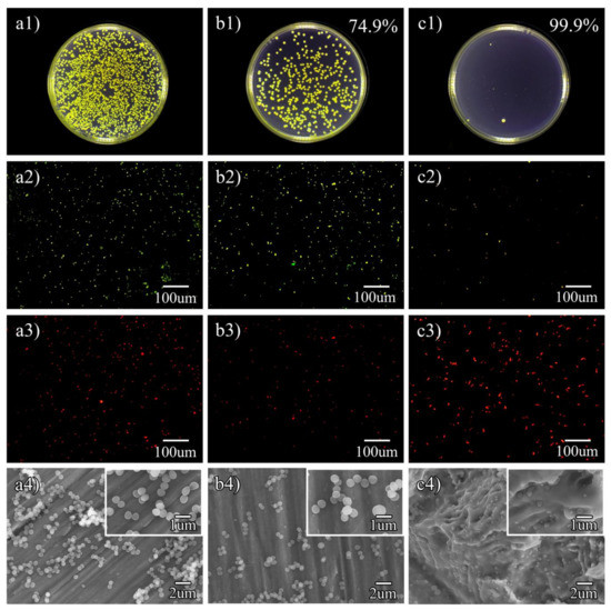 For live/dead fluorescent staining, the sample with bacteria was rinsed twice with 0.9% NaCl saline and stained in darkness for 15 min with LIVE/DEAD® BacLightTM Bacterial Activity Kit (L7007, Invitrogen, Walthanm, MA, USA). Then the excess dye was washed out with 0.9% NaCl saline, and the sample was observed under a fluorescence microscope (BX53, Olympus, Tokio, Japan) with 480/500 nm as the excitation/emission wavelength of green fluorescence and 490/635 nm as the excitation/emission wavelength of red fluorescence.